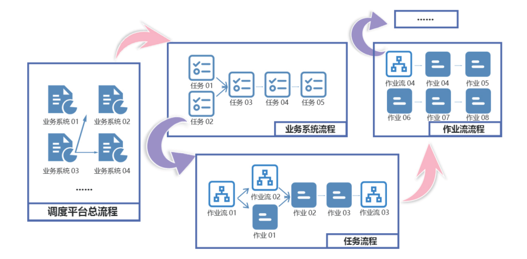 对于银行组织动辄百万级的作业量而言,分组分层是一种极为有效的管理方式,考虑到批处理作业间具有依赖性,北京云配查 信息技术股份公司(以下简称“云配查 ”)适时提出了流程化的管理思路:在纵向上,模拟目录与文件的结构关系进行作业管理;在横向上,将同一个层级归属为同一流程进行管理;在全局上,支持在任意两个对象间建立依赖关系。流程化管理思路如图1所示。